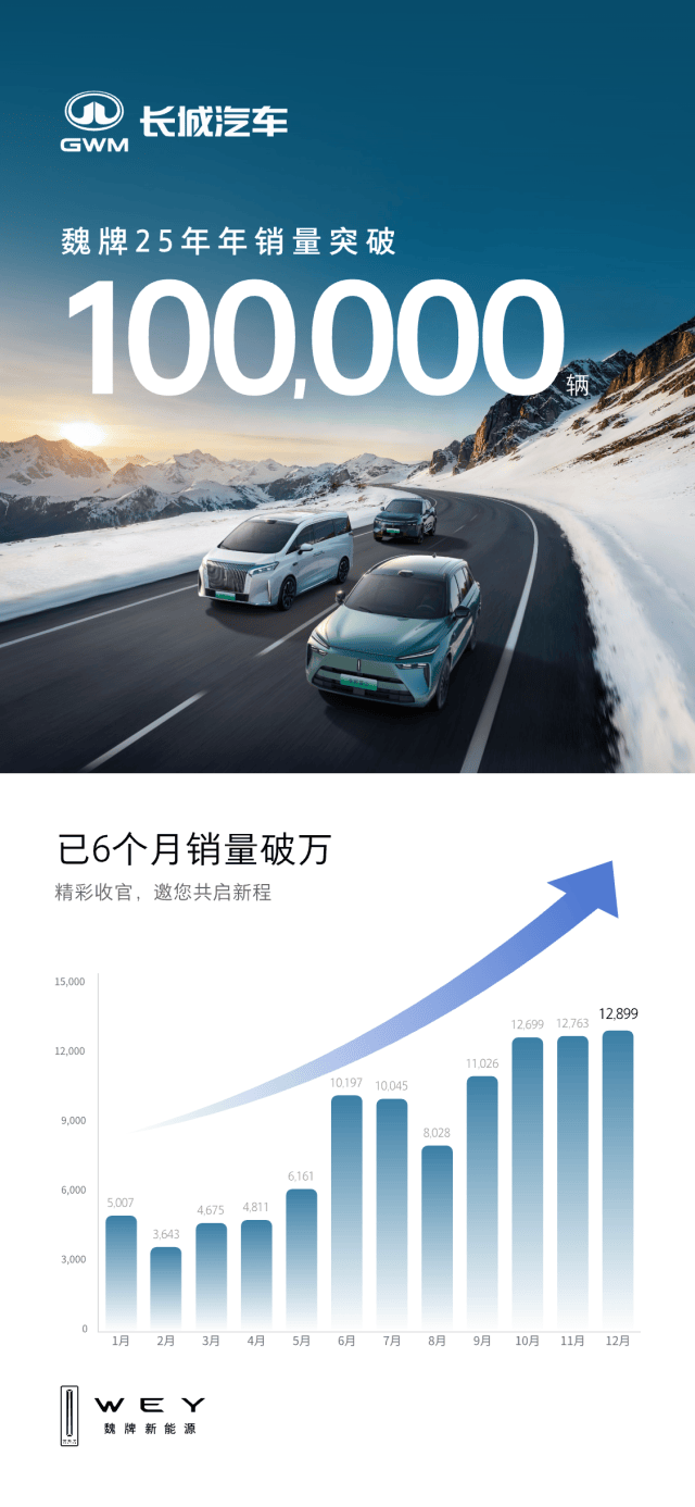 魏牌在2025年获得的实质性打破,首要体现在严寒的数字上。全年累计销量打破10万台,同比增加到达86%。这一销量效果被官方界说为“创下六年来的销量新高”,一起也是品牌前史上“第二好的增加势头”。销量的攀升并非稍纵即逝,其增加势头具有继续性。自2025年6月开端,魏牌月度销量便坚持上扬曲线月到达年度峰值,单月出售12899辆,同比增加83%。