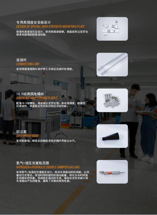 公司主营业务涵盖广泛,包括防晕车阻尼杆、稳底盘阻尼杆、盖茨阻尼杆、GACI阻尼杆、盖茨车身平衡杆、GACI车身平衡杆、盖茨阻尼器、GACI阻尼器、防晕车阻尼器、稳底盘阻尼器等。这一些产品各具特色,针对不同车辆类型与行驶环境,提供了定制化的解决方案。例如,防晕车阻尼杆通过优化阻尼特性,有实际效果的减少了车辆行驶过程中的颠簸与晃动,为乘客提供了更加平稳的乘坐体验;稳底盘阻尼杆则通过增强底盘的稳定性,提升了车辆在高速行驶或复杂路况下的操控性能;而盖茨车身平衡杆与GACI车身平衡杆,则通过平衡车身受力,减少了车辆在转弯或变道时的侧倾,逐步提升了行驶安全性。